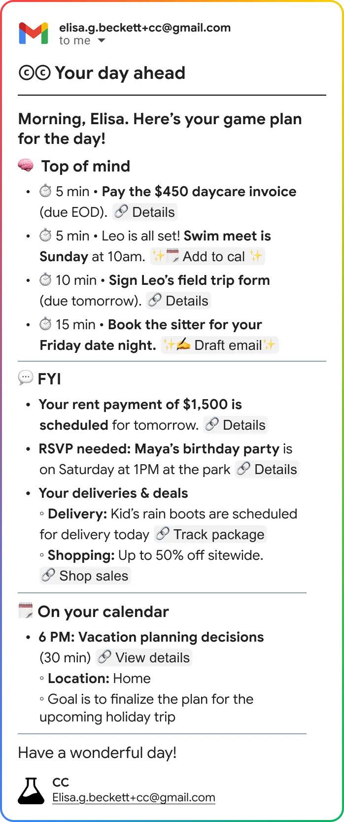 CC is a standalone experimental service provided by Google Labs. Your data in CC, including any feedback you choose to provide, is processed per the Google Privacy Policy. CC is not part of Google Workspace or Gemini Apps. The Workspace Labs Privacy Notice and the Gemini Apps Privacy Notice do not apply.
